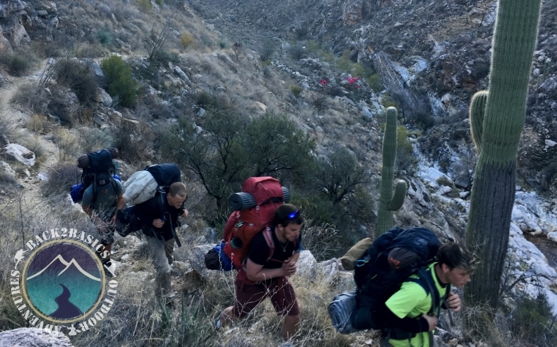 We woke up at 7 on Tuesday, packed all of our stuff, and preceded to hike down and out of Sabino Canyon. We were all expecting it to be mostly downhill, but attitudes soured and grumpiness set in as some going down a canyon meant hiking higher in elevation (physics is weird). But oh well. Despite being told we had 1-1.5 miles for like the last 4 miles of the trip (I promise it was funny to start with), we eventually made it down the canyon and back to the van. We then caught a meeting in Tucson, where Intern Guide Mike picked up his 8 month chip (congrats brother). Guide Nick had stocked up on some provisions during the meeting, so we were all eager to make it to Picacho to chow down on some pitas, despite the soul crushing hike the next day. Hilarity then ensued, as the wind seemed intent on defeating every attempt at setting up shelters, resulting in ripped ponchos, much yelling, and lots of frustrations. We all finally got everything set up and finally went to sleep as the rain settled in, and slept peacefully to the pitter patter of rain on tents.