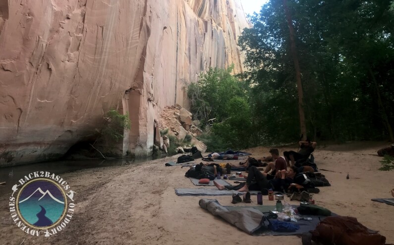 Our next night was spent next to an awesome pool with a waterfall we were able to swim under. One night we got to camp on a sandy shore next to the Escalante River which reminded everyone of the beach. This camp site was particularly cool because of the canyon wall being a 400ft sheer rock face hanging over us.