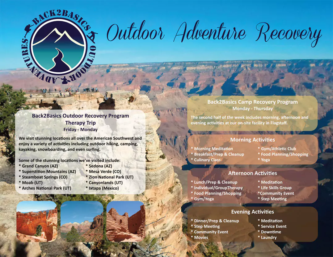 Below is an illustration of our Weekly Calendar for Back2Basics. It is important for our clients to learn to live a balanced life. Each week they are exposed to a combination of both wilderness outdoor and addiction treatment program as demonstrated throughout the schedule.